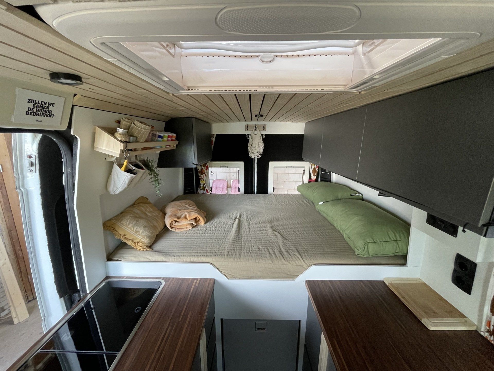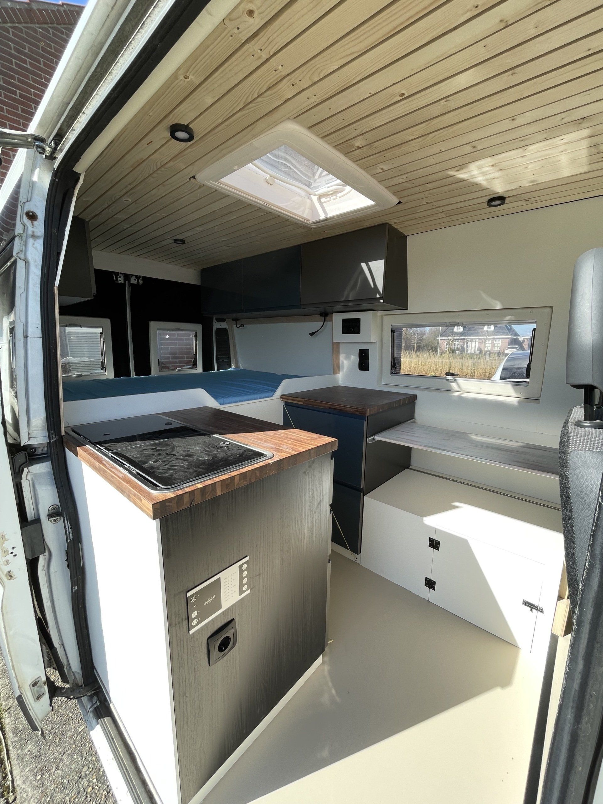 De klant is koning en geeft aan welke stijl ze in hun bus terug willen vinden. Natuurlijk helpen we ze daarbij, maar uiteindelijk is het hun camper. Deze L2H2 kreeg een hippie-achtig uiterlijk met twee draaistoelen en een kleine keuken.